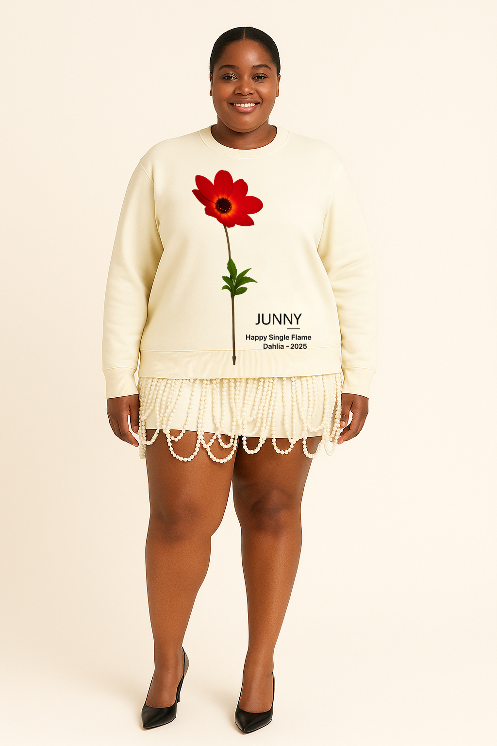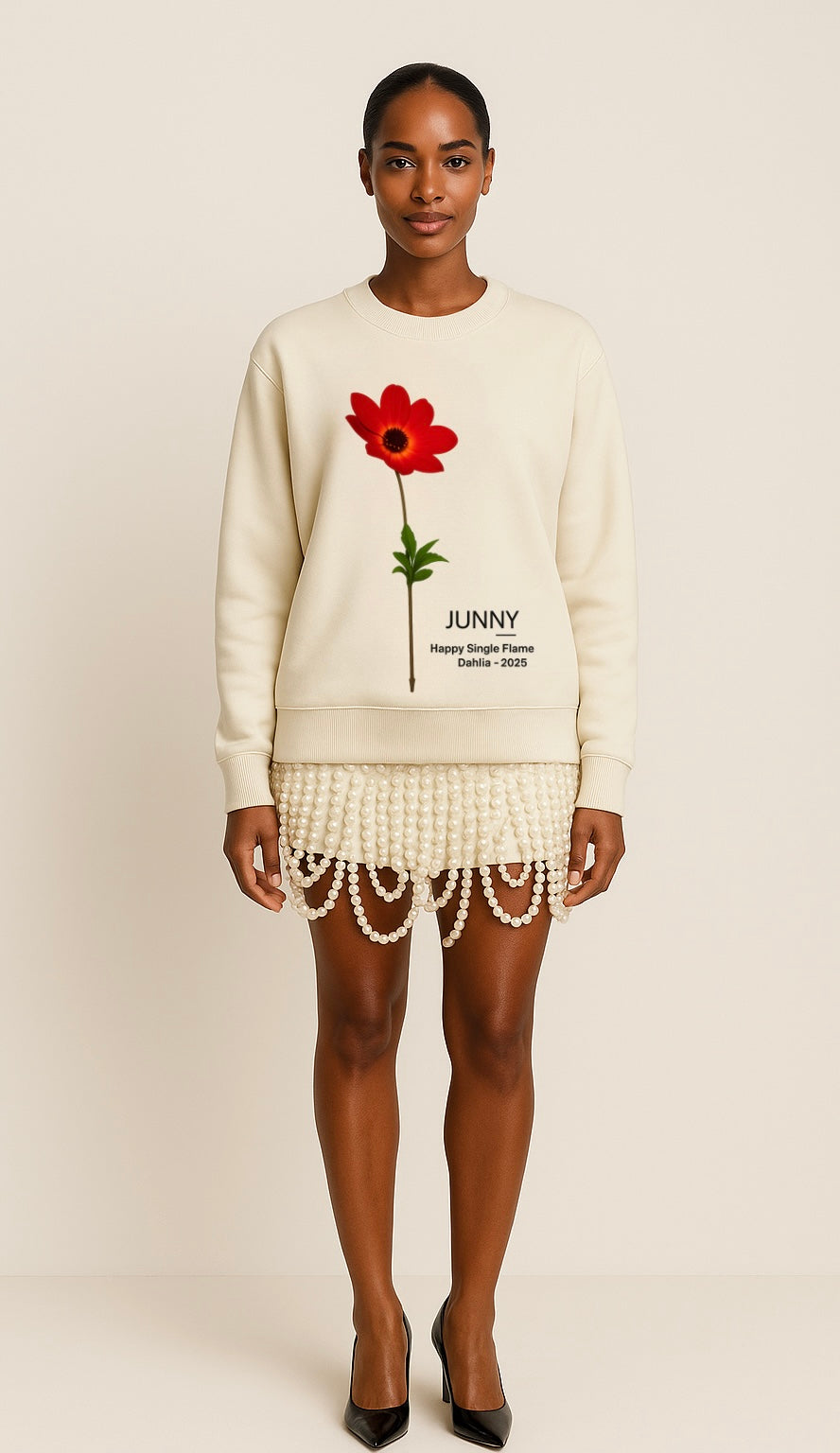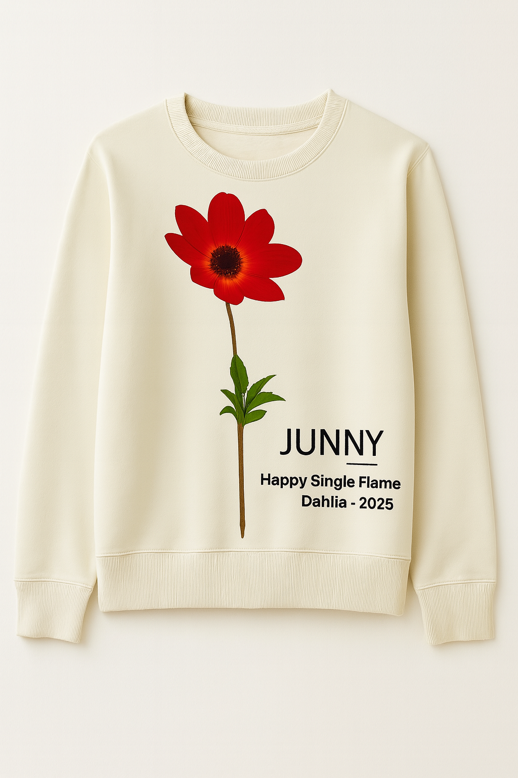 The JUNNY Happy Single Flame Dahlia Crewneck celebrates elegance through nature’s own artistry. Featuring a striking, radiant-red dahlia illustrated in high detail, this design captures the warmth, passion, and vibrancy of a 2025 “Happy Single Flame” bloom.